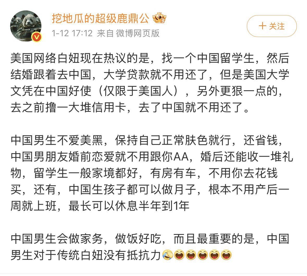 最开始这人刚在美国“崭露头角”的时候,刷小红书还看到好多女性支持他,可怜他被美国现状搞得快精神错乱了,所以虽然他言谈之中对女性极为不尊重也就算了,心疼一下这“孩子”,也心疼生活在水深火热中的美国人民。