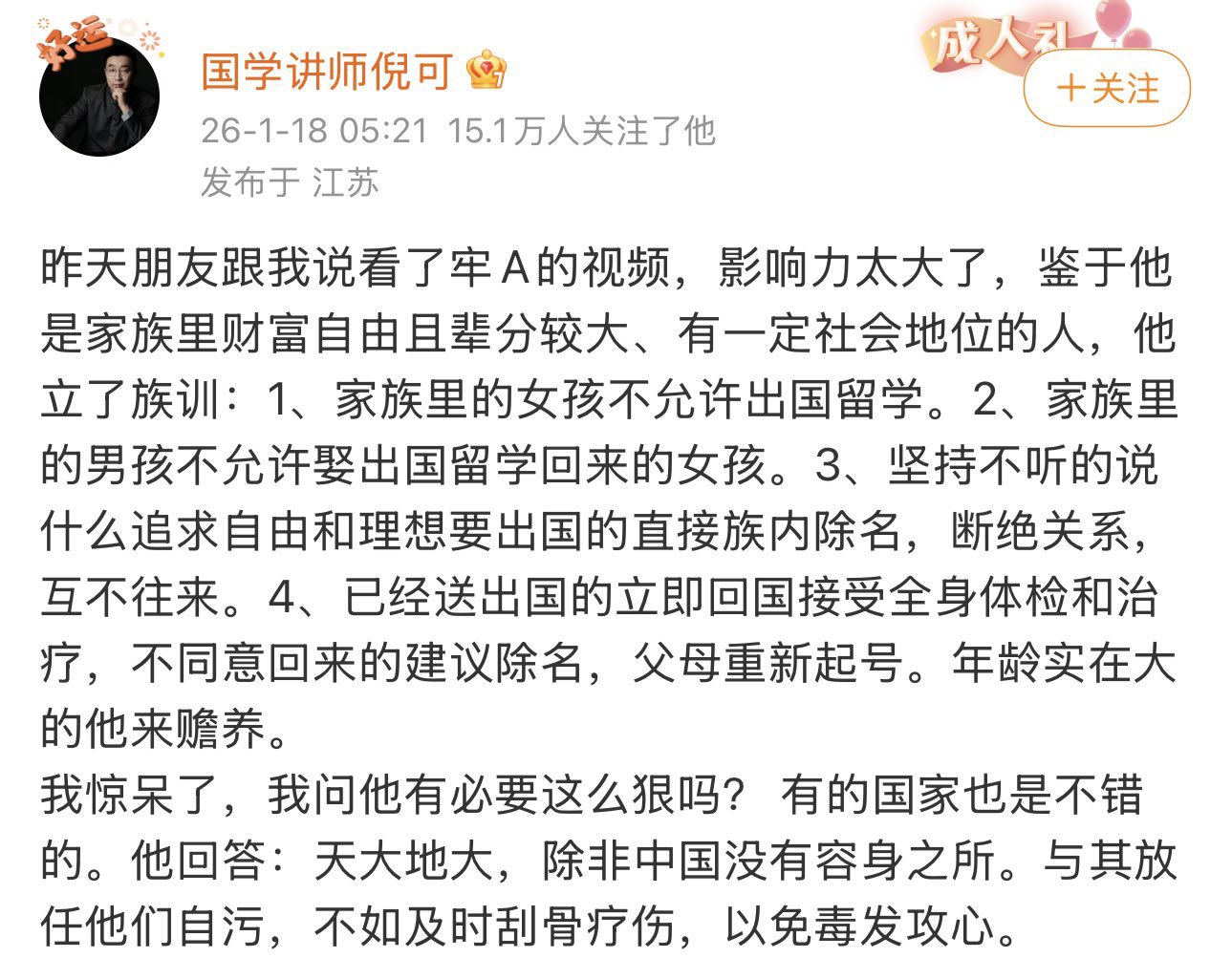 这几天随着孔大师对女留学生的大量造黄谣,一下把好多支持他的女性给整蒙圈了。心说:你讲美国底层的故事我听得津津有味,怎么突然开始这样?